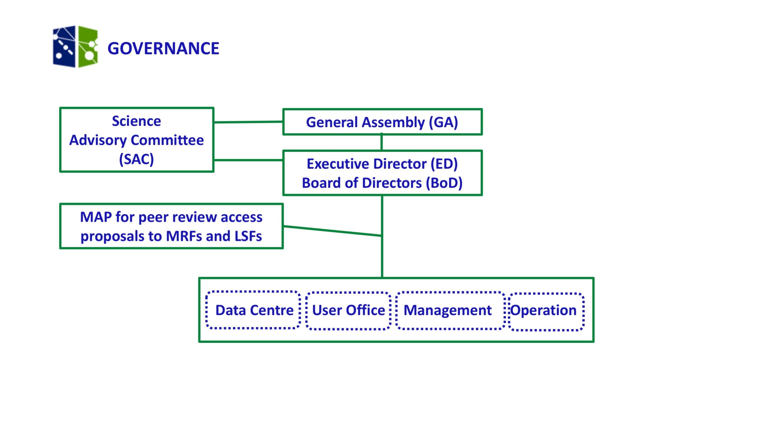 IM@IT has designed the simplest possible governance (see Figure 2) and access models required to fulfil the spirit of the ESFRI requirements. The governing bodies are: The General Assembly (GA), The Executive Director (ED), The Board of Directors (BoD) and, one external body, The Scientific Advisory Committee (SAC).