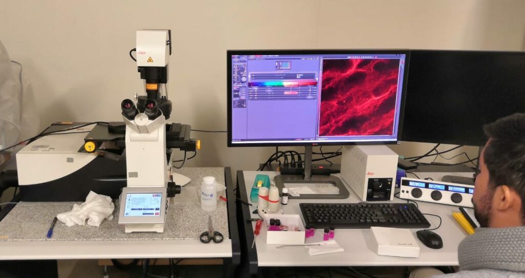 Laser Scanning Confocal Microscope Leica TCS SP8 equipped with DMI8 microscope, FCS Picoquant module and with PMT detector for transmission imaging and 5 internal detectors.