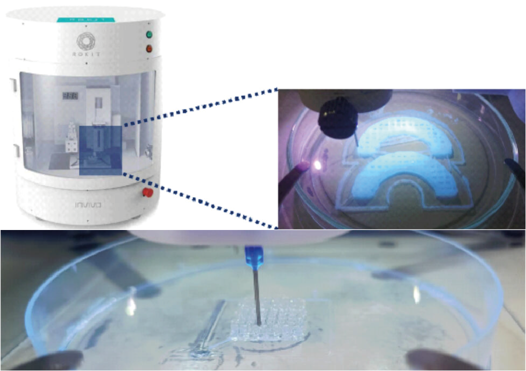 The image on the left shows the 3D bioprinter ROKIT INVIVO. The bioprinter precisely deposits photocrosslinkable bioinks to create complex scaffolds (i.e., meniscus) useful for regenerative medicine.