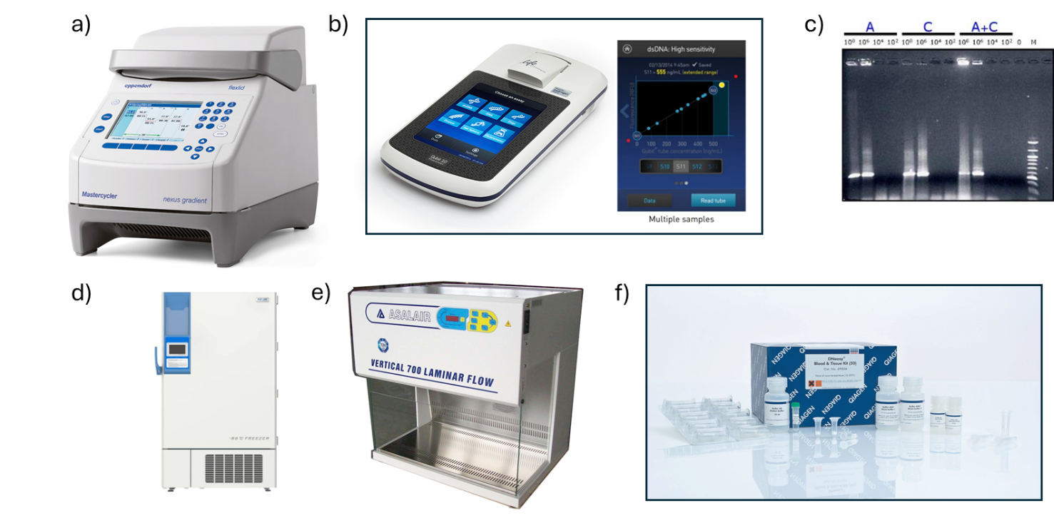EcoBiM LAB is equipped for standardized extraction and quality control of microbial DNA from a wide range of environmental matrices. Core instrumentation includes laminar-flow biosafety cabinets for sterile sample handling, refrigerated bench-top and high-speed centrifuges for cell concentration and phase separation, and −20 °C/−80 °C freezers for long-term storage of samples and nucleic acids. DNA quantity and integrity are assessed using a Qubit fluorometer with dedicated assays for double-stranded DNA, agarose gel electrophoresis systems for visualization of fragment size and degradation patterns, and thermocyclers for endpoint PCR and method validation. The laboratory is organized in clean and post-PCR areas, enabling contamination-controlled workflows from sample receipt to DNA aliquoting for downstream sequencing and other molecular analyses.