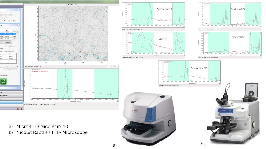 Particles Analysis via Nicolet™ iN™10 and via Nicolet RaptIR-FTIR Microscope can be performed on filters, where microplastics and other anthropogenic litter were collected after the extraction from several environmental matrices: seawater, wasterwater, stormwater, drinking water, wet and dry depositions, atmospheric aerosol, snow, sediments, soil, permafrost, organisms, e.g., mussels, clams, small benthic and zooplanktonic invertebrates, crustaceans, fish. The analysis can also be performed on large microplastics (from 5 mm down to 1 mm). Particles analysis via Micro-FTIR allows quantification and simultaneous polymer identification of plastic particles (including bioplastics), and of other anthropogenic particles such as plastic additives, (e.g., cross-linkers, vulcanizers, antioxidants, lubricants, flame retardants, plasticizers, etc), artificial and natural fibers. It can be employed for analysis of microplastics, but also for analysis of microfossils, artistic handiworks, pharmaceutical, etc. The instruments are equipped with various reference libraries.